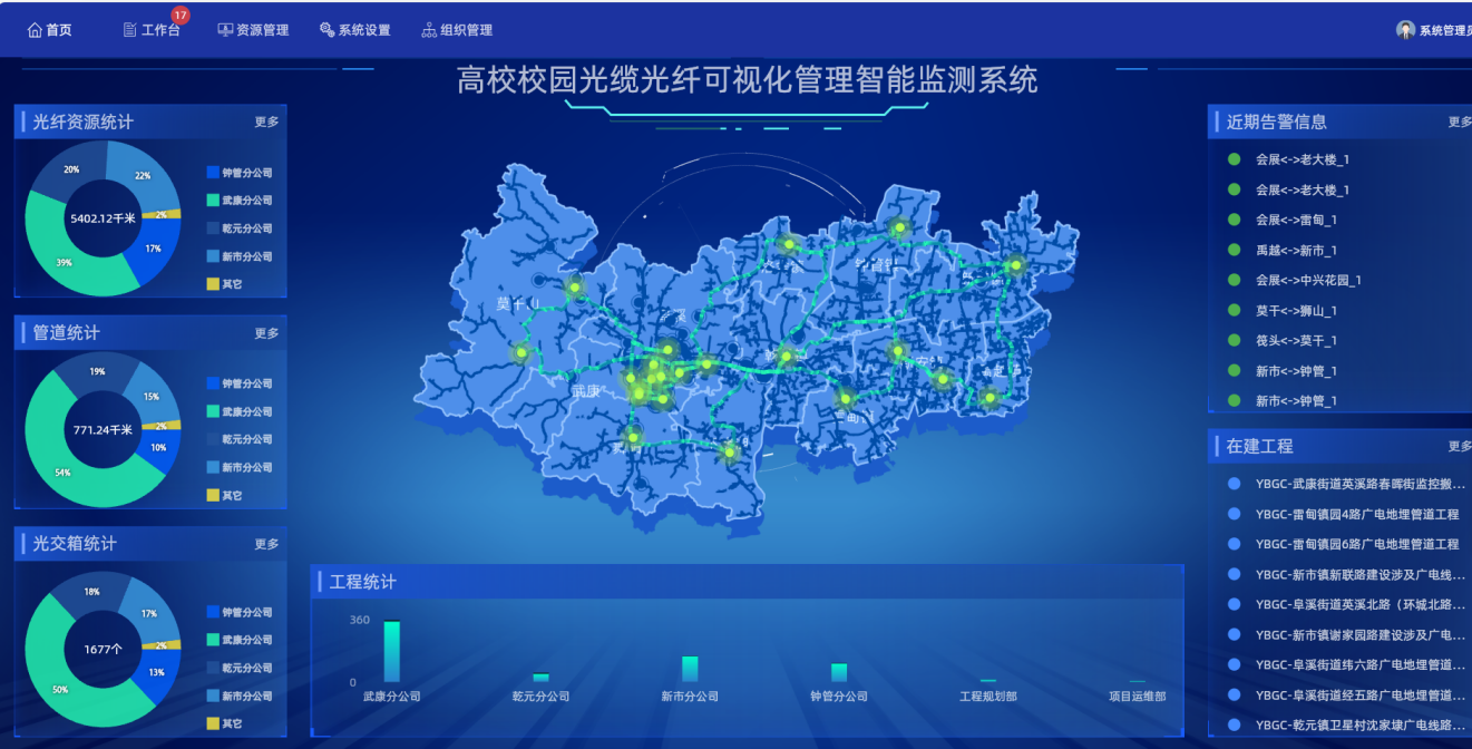 一.项目概括 郑州大学网络管理中心承担着全省70余家接入单位的约60多万宽带IP用户的省主节点网络中心的运行任务,参与完成了以2.5Gbps带宽连接全省18个地市的河南省教育科研计算机网主干网的建设任务;承担郑州大学四个校区和六个家属区近二百四十栋楼宇的网络运行维护工作;为全省教育和科研网的用户提供着365天×24小时不间断的互联网服务。 郑州大学校园光缆管线网络复杂,管井管道、光纤、光交箱内部端口及机房ODF端口占用不清、路由走向记录模糊等都是目前存在的普遍问题,针对郑州大学所面临的具体问题如下: 1.校园光缆光纤网络资源具有无源、量大、分布广并且大多为“哑资源”的特点,校园越大使得管理起来愈发复杂。光纤资源的物理位置、连接关系、纤芯端口占用情况等信息还是依靠表格、示意图纸、老师傅记忆经验,无法满足现状管理的需求。 2.光缆资源管理的业务工作比较繁多杂乱,手工进行管理操作又费时费力费钱,因此在校园网资源管理中出现了杂乱、不规范、无规律的现象,给校园网的日常维护带来了很大困难,甚至某些故障是由于施工人员对光缆铺设情况不清晰或复杂的技术问题,导致无法及时解决,或者解决途径过于劳民伤财,给校园师生的工作学习带来了诸多不便。 3.校园管廊内存在大量废弃、老化或不再使用的通信线路(以下简称“废线”)。这些废线不仅占用了宝贵的管廊空间资源,还可能对正常运行的通信线路造成干扰和安全隐患。 4.光缆故障定位困难:高校校园所敷设光缆线路往往距离较长,光缆一旦发生故障,传统方式用手动OTDR打距离估算故障点位置,导致故障点查找抢修恢复时间长,影响视频监控、教学宽带、图书馆专用网络等专线系统使用。 5.各个高等院校都处于高速发展的阶段,随着校园不断建设和光缆规模不断扩大,高校网络业务管理的工作需求已经无法再用低质量低效率的手工操作来满足了,急需建立一套科学合理而又功能完善的校园网管线及光缆光纤可视化管理智能监测系统。 当今,随着校园建设的蓬勃发展、计算机技术的突破,校园网内的各种网络资源也在不断建设和扩展:光缆、接续盒、光纤、光交箱传输过程的节点、各种线路的承载资源。将来一定会是智能化、可视化的管理,实现校园管理的智能感知和智能服务,这一目标的实现将会开启一项新的服务模式与业务处理,这将时时刻刻改变着校园师生的日常生活及工作等,真正使通信和信息化成为高校校园网的不断进步和发展,到时利用校园网开展各种网络教学活动、网络课程、数字化图书馆、教务管理等应用项目,提升校园整理数字化、信息化管理水平。 二.建设成果高校校园光缆管理“一张图”