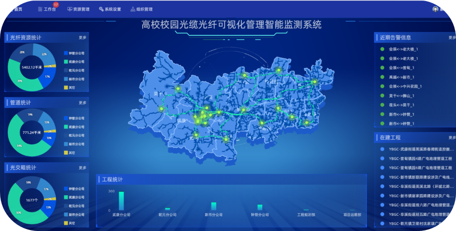 高校校园光缆光纤可视化管理智能监测“一张图” 高校校园网管线及光缆光纤可视化管理智能监测系统,创造性地将“网络资源管理+光缆在线监测”相结合,更加精细化将校园光缆实际路由线路位置、设备位置、光纤链路信息、光交箱端口信息等呈现在一张图上。 同时搭载光缆在线监测硬件设备对线路建设阶段的接续盒位置、维护阶段的故障抢修点的测试距离进行记录和迭代,为故障定位提供依据,线路段距离信息应能根据线路变动(包括改迁、抢修等造成线路距离变更)进行智能更新。 通过图形化的界面,软件能够清晰地展示校园通信传输光缆资源的分布、连接情况以及故障位置等信息,使管理人员能够直观了解光缆资源的情况。 高校校园网管线及光缆光纤可视化管理智能监测系统能够实时监控光缆资源的状态,包括光缆的损耗、信号强度等关键指标,并提供数据分析功能,帮助校方管理人员及时发现潜在问题并采取措施。 移动端运维办公支持 支持户外通信资源采集、浏览、查询 高校校园网管线及光缆光纤可视化管理智能监测系统自带手机端APP软件,使得现场工作人员能够随时记录光缆资源、接续盒资源、管井等户外资源的情况、上传照片和文字描述,并于网络信息中心进行数据同步,提高信息的实时性和准确性。